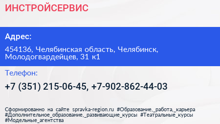ИНСТРОЙСЕРВИС по адресу 454136, Челябинская область, Челябинск, Молодогвардейцев, 31 к1 в дальнейшем Организация, размещена в следующих категориях: