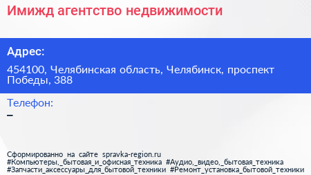 Имижд, агентство недвижимости по адресу 454100, Челябинская область, Челябинск, проспект Победы, 388 в дальнейшем Организация, размещена в следующих категориях: