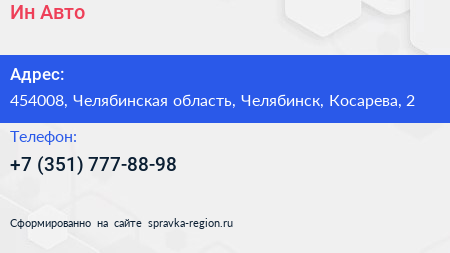 Ин Авто по адресу 454008, Челябинская область, Челябинск, Косарева, 2 в дальнейшем Организация, размещена в следующих категориях: