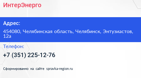 ИнтерЭнерго по адресу 454080, Челябинская область, Челябинск, Энтузиастов, 12а в дальнейшем Организация, размещена в следующих категориях: