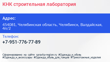КНК, строительная лаборатория по адресу 454081, Челябинская область, Челябинск, Валдайская, 4п/2 в дальнейшем Организация, размещена в следующих категориях: