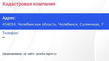 Кадастровая компания по адресу 454014, Челябинская область, Челябинск, Солнечная, 7 в дальнейшем Организация, размещена в следующих категориях: