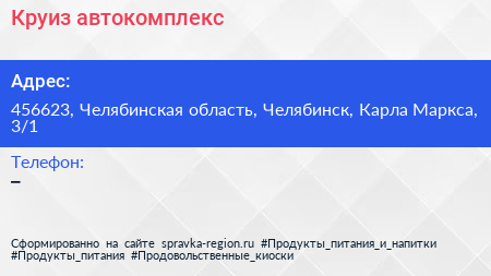 Круиз, автокомплекс по адресу 456623, Челябинская область, Челябинск, Карла Маркса, 3/1 в дальнейшем Организация, размещена в следующих категориях: