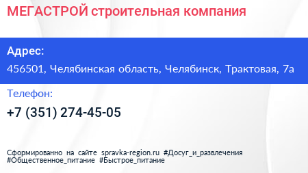 МЕГАСТРОЙ, строительная компания по адресу 456501, Челябинская область, Челябинск, Трактовая, 7а в дальнейшем Организация, размещена в следующих категориях: