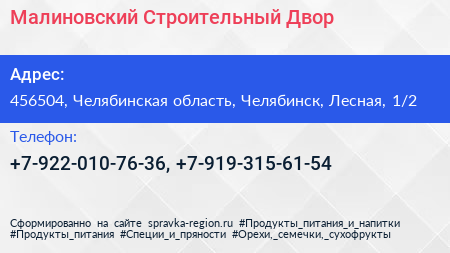Малиновский Строительный Двор по адресу 456504, Челябинская область, Челябинск, Лесная, 1/2 в дальнейшем Организация, размещена в следующих категориях:
