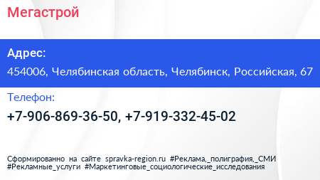 Мегастрой по адресу 454006, Челябинская область, Челябинск, Российская, 67 в дальнейшем Организация, размещена в следующих категориях: