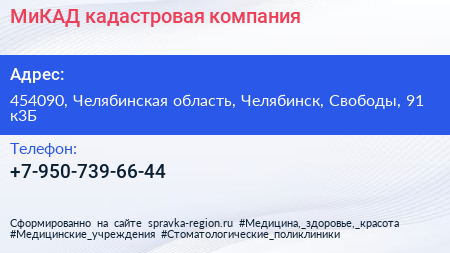МиКАД, кадастровая компания по адресу 454090, Челябинская область, Челябинск, Свободы, 91 к3Б в дальнейшем Организация, размещена в следующих категориях: