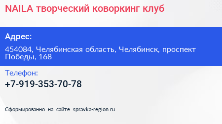 NAILA, творческий коворкинг клуб по адресу 454084, Челябинская область, Челябинск, проспект Победы, 168 в дальнейшем Организация, размещена в следующих категориях: