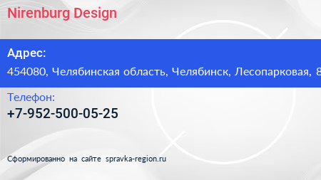 Nirenburg.Design по адресу 454080, Челябинская область, Челябинск, Лесопарковая, 8 в дальнейшем Организация, размещена в следующих категориях: