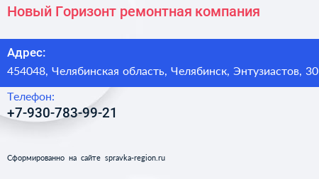 Новый Горизонт, ремонтная компания по адресу 454048, Челябинская область, Челябинск, Энтузиастов, 30 в дальнейшем Организация, размещена в следующих категориях: