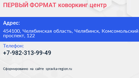 ПЕРВЫЙ ФОРМАТ, коворкинг-центр по адресу 454100, Челябинская область, Челябинск, Комсомольский проспект, 122 в дальнейшем Организация, размещена в следующих категориях: