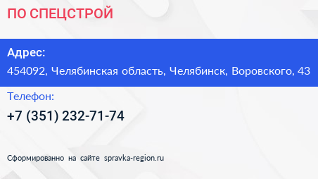 ПО СПЕЦСТРОЙ по адресу 454092, Челябинская область, Челябинск, Воровского, 43 в дальнейшем Организация, размещена в следующих категориях:
