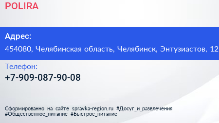 POLIRA по адресу 454080, Челябинская область, Челябинск, Энтузиастов, 12 в дальнейшем Организация, размещена в следующих категориях:
