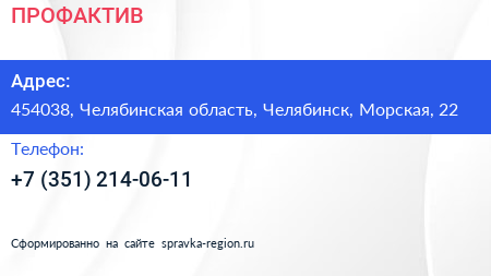 ПРОФАКТИВ по адресу 454038, Челябинская область, Челябинск, Морская, 22 в дальнейшем Организация, размещена в следующих категориях: