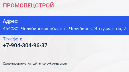 ПРОМСПЕЦСТРОЙ по адресу 454080, Челябинская область, Челябинск, Энтузиастов, 7 в дальнейшем Организация, размещена в следующих категориях: