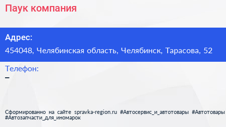 Паук, компания по адресу 454048, Челябинская область, Челябинск, Тарасова, 52 в дальнейшем Организация, размещена в следующих категориях: