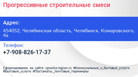 Прогрессивные строительные смеси по адресу 454052, Челябинская область, Челябинск, Комаровского, 4а в дальнейшем Организация, размещена в следующих категориях:
