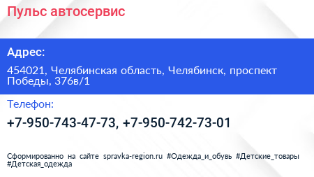 Пульс, автосервис по адресу 454021, Челябинская область, Челябинск, проспект Победы, 376в/1 в дальнейшем Организация, размещена в следующих категориях: