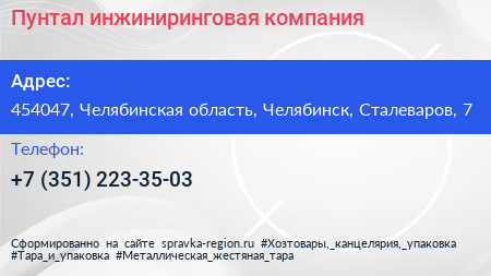 Пунтал, инжиниринговая компания по адресу 454047, Челябинская область, Челябинск, Сталеваров, 7 в дальнейшем Организация, размещена в следующих категориях: