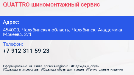 QUATTRO, шиномонтажный сервис по адресу 454003, Челябинская область, Челябинск, Академика Макеева, 2/1 в дальнейшем Организация, размещена в следующих категориях: