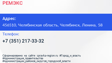 РЕМЭКС по адресу 456510, Челябинская область, Челябинск, Ленина, 58 в дальнейшем Организация, размещена в следующих категориях: