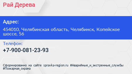Рай Дерева по адресу 454010, Челябинская область, Челябинск, Копейское шоссе, 56 в дальнейшем Организация, размещена в следующих категориях: