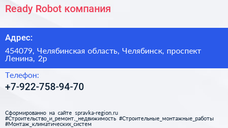 Ready Robot, компания по адресу 454079, Челябинская область, Челябинск, проспект Ленина, 2р в дальнейшем Организация, размещена в следующих категориях: