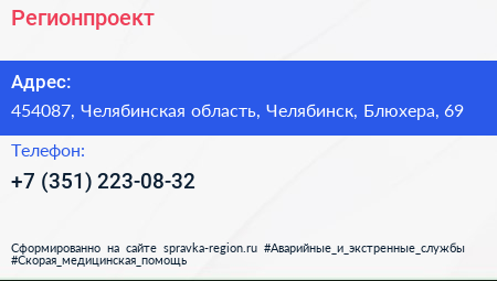 Для связи с организацией воспользуйтесь номером телефона: +7 (351) 223-08-32. Пн: c 08:30-17:30, Вт: c 08:30-17:30, Ср: c 08:30-17:30, Чт: c 08:30-17:30, Пт: c 08:30-17:30, Сб: выходной, Вс: выходной, вы можете обратиться в эту организацию.