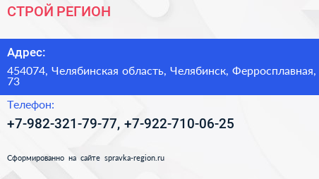 СТРОЙ РЕГИОН по адресу 454074, Челябинская область, Челябинск, Ферросплавная, 73 в дальнейшем Организация, размещена в следующих категориях: