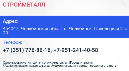 СТРОЙМЕТАЛЛ по адресу 454047, Челябинская область, Челябинск, Павелецкая 2-я, 28 в дальнейшем Организация, размещена в следующих категориях: