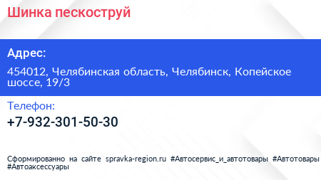 Шинка-пескоструй по адресу 454012, Челябинская область, Челябинск, Копейское шоссе, 19/3 в дальнейшем Организация, размещена в следующих категориях: