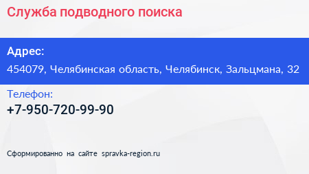 Служба подводного поиска по адресу 454079, Челябинская область, Челябинск, Зальцмана, 32 в дальнейшем Организация, размещена в следующих категориях: