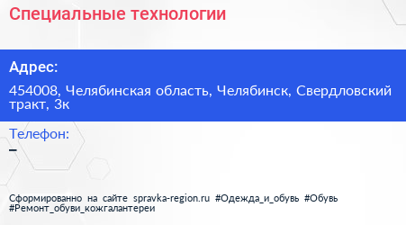 Специальные технологии по адресу 454008, Челябинская область, Челябинск, Свердловский тракт, 3к в дальнейшем Организация, размещена в следующих категориях:
