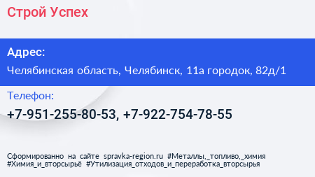 Строй Успех по адресу Челябинская область, Челябинск, 11а городок, 82д/1 в дальнейшем Организация, размещена в следующих категориях: