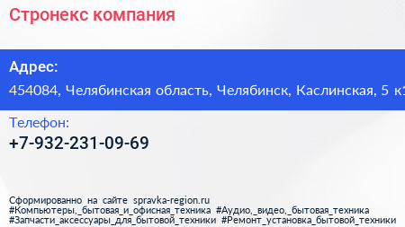 Стронекс, компания по адресу 454084, Челябинская область, Челябинск, Каслинская, 5 к1 в дальнейшем Организация, размещена в следующих категориях: