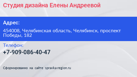 Студия дизайна Елены Андреевой по адресу 454008, Челябинская область, Челябинск, проспект Победы, 182 в дальнейшем Организация, размещена в следующих категориях: