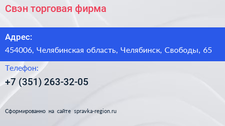 Свэн, торговая фирма по адресу 454006, Челябинская область, Челябинск, Свободы, 65 в дальнейшем Организация, размещена в следующих категориях: