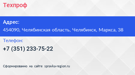 Техпроф по адресу 454090, Челябинская область, Челябинск, Маркса, 38 в дальнейшем Организация, размещена в следующих категориях: