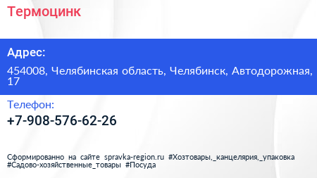 Термоцинк по адресу 454008, Челябинская область, Челябинск, Автодорожная, 17 в дальнейшем Организация, размещена в следующих категориях: