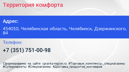 Территория комфорта по адресу 454010, Челябинская область, Челябинск, Дзержинского, 84 в дальнейшем Организация, размещена в следующих категориях: