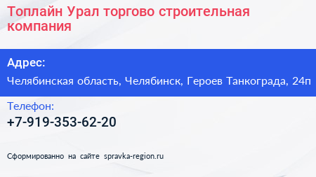 Топлайн-Урал, торгово-строительная компания по адресу Челябинская область, Челябинск, Героев Танкограда, 24п в дальнейшем Организация, размещена в следующих категориях: