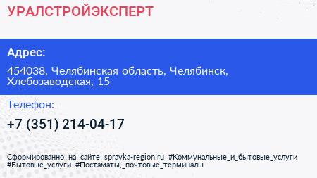 УРАЛСТРОЙЭКСПЕРТ по адресу 454038, Челябинская область, Челябинск, Хлебозаводская, 15 в дальнейшем Организация, размещена в следующих категориях: