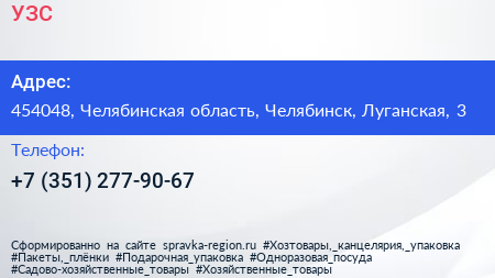 Для связи с организацией воспользуйтесь номером телефона: +7 (351) 277-90-67. Пн: c 09:00-17:00, Вт: c 09:00-17:00, Ср: c 09:00-17:00, Чт: c 09:00-17:00, Пт: c 09:00-17:00, Сб: выходной, Вс: выходной, вы можете обратиться в эту организацию.