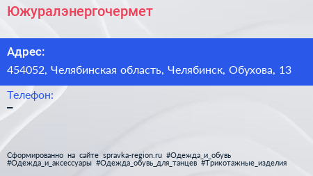 Южуралэнергочермет по адресу 454052, Челябинская область, Челябинск, Обухова, 13 в дальнейшем Организация, размещена в следующих категориях: