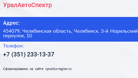 УралАвтоСпектр по адресу 454079, Челябинская область, Челябинск, 3-й Норильский переулок, 10 в дальнейшем Организация, размещена в следующих категориях: