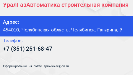 УралГазАвтоматика, строительная компания по адресу 454010, Челябинская область, Челябинск, Гагарина, 9 в дальнейшем Организация, размещена в следующих категориях: