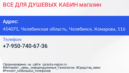 ВСЕ ДЛЯ ДУШЕВЫХ КАБИН, магазин по адресу 454071, Челябинская область, Челябинск, Комарова, 116 в дальнейшем Организация, размещена в следующих категориях: