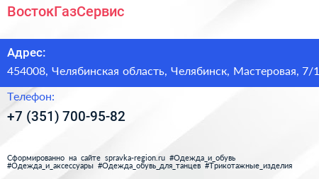 ВостокГазСервис по адресу 454008, Челябинская область, Челябинск, Мастеровая, 7/1 в дальнейшем Организация, размещена в следующих категориях: