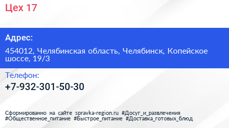 Цех 17 по адресу 454012, Челябинская область, Челябинск, Копейское шоссе, 19/3 в дальнейшем Организация, размещена в следующих категориях:
