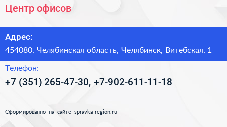 Центр офисов по адресу 454080, Челябинская область, Челябинск, Витебская, 1 в дальнейшем Организация, размещена в следующих категориях: